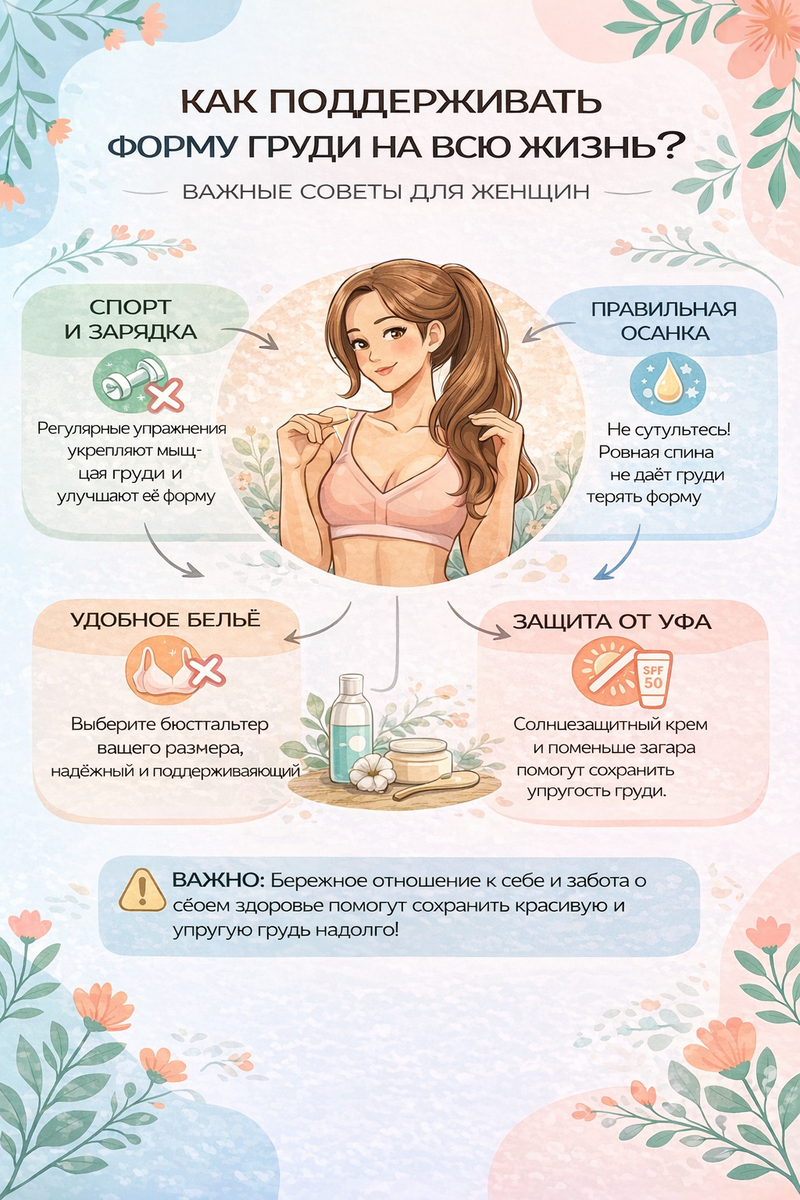Всем привет! Сегодня наткнулся на одну милую инфографику про то, как сохранить форму груди. Знаете, такие картинки с цветочками и советами в духе «просто не сутультесь». Посмотрел я на это, и внутри включился мой внутренний скептик-историк. Давайте будем честными, вопрос эстетики женского тела всегда был завязан на огромные деньги. Если копнуть в историю, еще в начале XX века, когда на смену тугим корсетам пришли первые бюстгальтеры Иды Розенталь, индустрия поняла: на страхе «потери формы» можно строить империи. Maidenform в 30-е годы тратили баснословные суммы на рекламу, внушая, что без их поддержки природа возьмет свое слишком быстро. В инфографике пишут: «упражнения укрепляют мышцы». Звучит логично, но есть нюанс. Сама грудь — это железистая и жировая ткань, там нет мышц, которые можно «накачать», чтобы они подняли объем вверх. Мы качаем большую грудную мышцу, которая лежит под ней. Я иногда думаю, что советы про спорт — это такая попытка дать нам контроль там, где его почти нет. Г