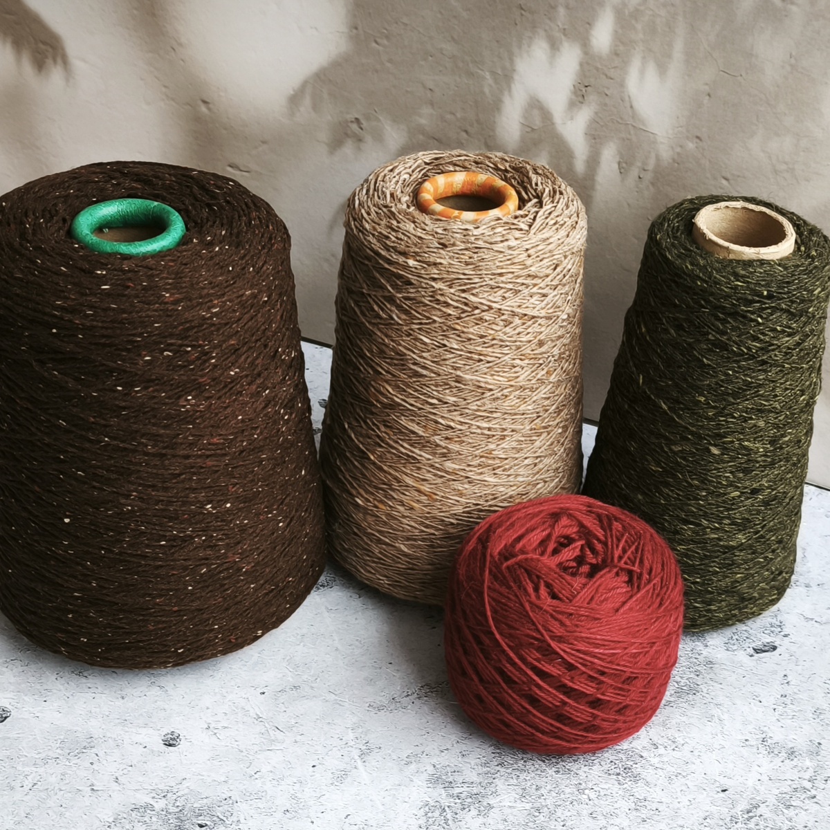 Артикул Puzzle, тоже твид с составом меринос 60%, вискоза 20%, па 20%, 380 м/100 г. Чтобы подтянуть толщину под толщину коричневой пряжи добавляю нить Суперджилонга от Zegna Baruffa, 1500м/100г в бежевом цвете.