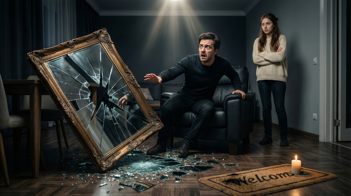 И понеслось. Всё в замедленной съёмке. Я потянулся, чтобы ухватиться за что-нибудь. Рука наткнулась на край стола. Свеча, эта предательница, качнулась, плюхнулась на коврик «Welcome» (ирония!) и погасла с шипением. А зеркало… Оно с лёгким, почти музыкальным звоном соскользнуло на паркет. И разбилось. Не на пару частей, а на десяток острых, злобно блестящих осколков. Звук был таким чистым и звонким, что на секунду воцарилась абсолютная тишина.