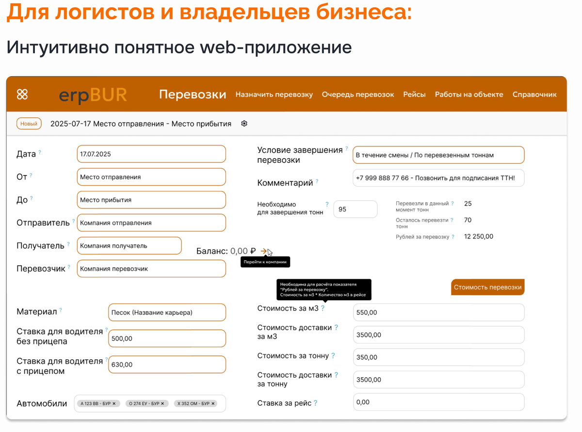 eBUR — это TMS-платформа для управления автопарком и спецтехникой. Система изначально проектируется под реальные процессы логистики: рейсы, загрузку техники, работу водителей и прозрачный учет денег — без Excel, звонков и ручных отчетов.