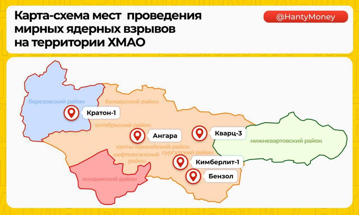 В 1978–1985 годах было проведено пять подземных ядерных взрывов общей мощностью около 70 килотонн — почти вдвое больше, чем бомбы, сброшенные на Хиросиму и Нагасаки. Они проходили в рамках советской программы «Ядерные взрывы для народного хозяйства» и использовались для сейсмозондирования и стимуляции нефтеотдачи пластов. «Кратон-1» (1978, Березовский район) — 22 кт, глубина 593 м, цель — изучение земной коры. «Кимберлит-1» (1979, Нефтеюганский район) — 22 кт, глубина 837 м, сейсмозондирование; жители отмечали сильную ударную волну. «Ангара» (1980, Красноленинское месторождение) — 15 кт, глубина 2485 м, стимуляция нефтеотдачи. «Кварц-3» (1984, Лянтор) — 8,5 кт, глубина 726–730 м, сейсмозондирование. «Бензол» (1985, Пыть-Ях) — 2,5 кт, рекордная глубина 2860 м, стимуляция нефтеотдачи; считается самым глубоким ядерным взрывом в мире. Несмотря на мифы о мутировавших животных и ухудшении экологии, инженеры и ученые утверждают, что все взрывы были герметичными, радиация на поверхность