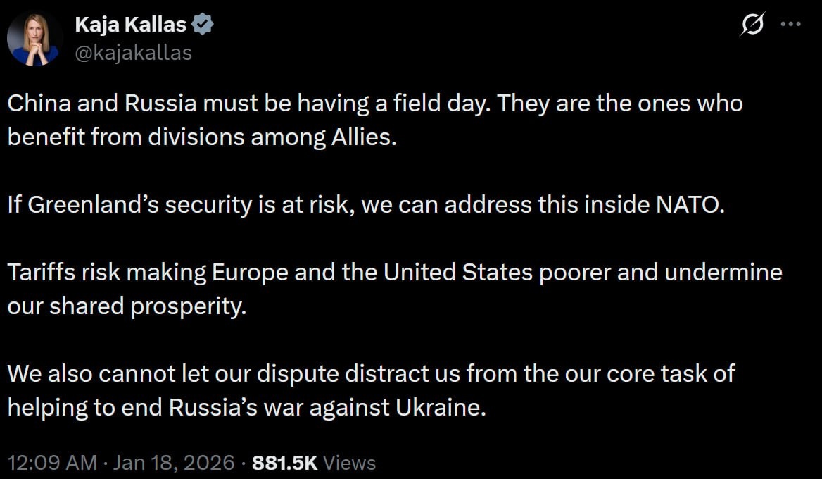 : Китай и Россия, должно быть, ликуют. Именно они выигрывают от раскола среди союзников. Если безопасность Гренландии окажется под угрозой, мы можем решить этот вопрос в рамках НАТО. Тарифы грозят сделать Европу и Соединенные Штаты беднее и подрывают наше общее процветание. Мы также не можем позволить нашему спору отвлечь нас от основной задачи — помощи в прекращении войны России против Украины. 🟪Читай в Max | 🚀Читай в Telegram | 🥰Смотри на RUTUBE