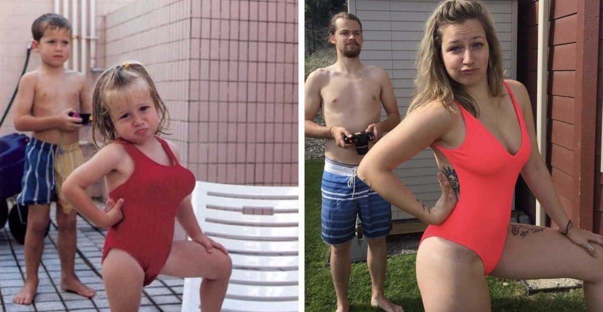 Мало кто может внятно объяснить, зачем их тянет переснимать старые фото, да еще и непременно в тех же позах и одежде. Вроде ностальгия чистой воды, но с другой — до чего же нелепо выглядят дядьки и тетки, когда косплеят младенцев. С другой стороны, в этом и суть, показать, насколько данные персонажи изменились. А то вдруг не поверят! Да и просто веселье никто не отменял, подходящий повод