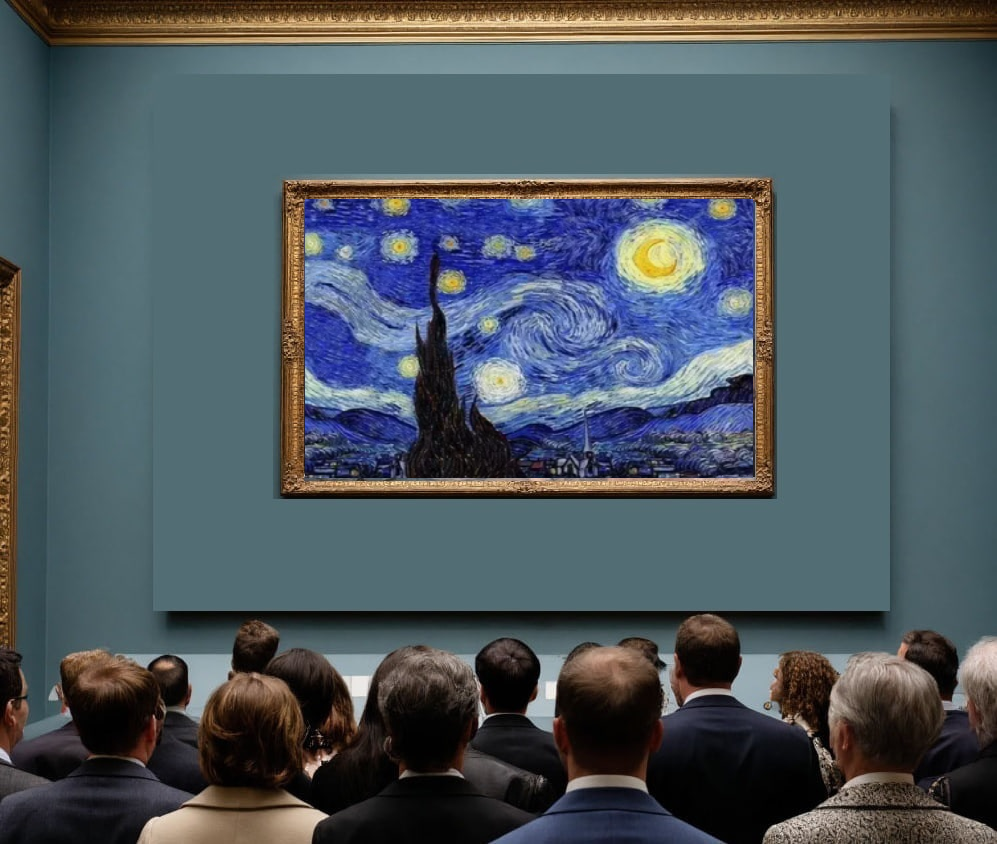 Картина «Звёздная ночь» Винсента Ван Гога поражает воображение живым, словно движущимся ночным небом и заставляет задуматься о бесконечности вселенной и хрупкости человеческой жизни. Это полотно не только показывает красоту ночи, но и передаёт внутренние переживания художника, его тревогу и стремление к свету среди темноты. Передо мной предстаёт ночной пейзаж: над тихой деревней раскинулось глубокое синее небо, полное ярких звёзд и изогнутых световых вихрей. Золотистые звёзды и полумесяц сияют так сильно, что кажется, будто они пульсируют и освещают всё вокруг, превращая обычную ночь в фантастическое зрелище. На переднем плане возвышается тёмный кипарис, напоминающий языки огня, тянущиеся к небу, и этот контраст тьмы и света делает картину особенно выразительной. Деревушка внизу выглядит спокойной и почти нереальной: небольшие домики утопают в синеватой тени, но в окнах горит тёплый свет, который перекликается с сиянием звёзд. Высокий шпиль церкви как будто соединяет землю и небо, по