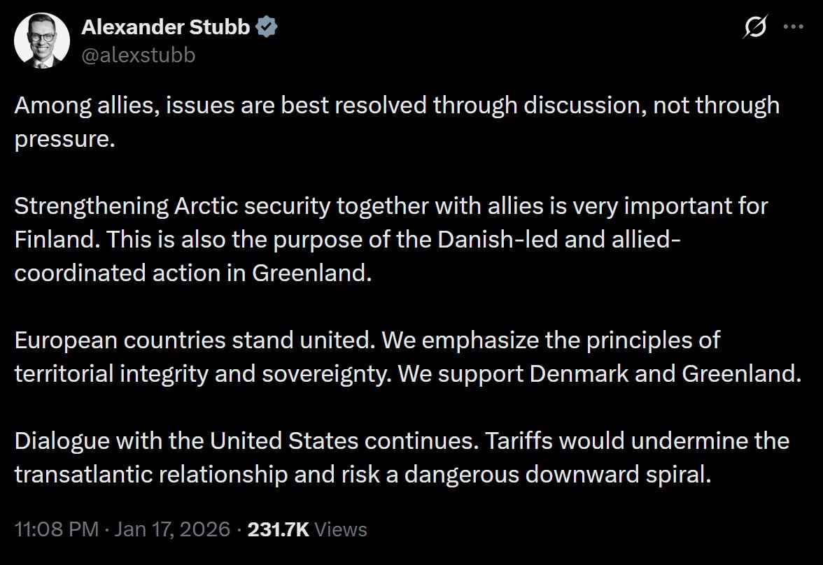: В отношениях между союзниками проблемы лучше всего решать путём диалога, а не давления. Укрепление безопасности в Арктике совместно с союзниками имеет для Финляндии очень большое значение. Именно в этом и заключается цель действий в Гренландии, осуществляемых под руководством Дании и при координации с союзниками. Страны Европы выступают единым фронтом. Мы подчёркиваем важность принципов территориальной целостности и суверенитета. Мы поддерживаем Данию и Гренландию. Диалог с Соединёнными Штатами продолжается. Введение пошлин может подорвать трансатлантические отношения и рискует запустить опасную нисходящую спираль. 🟪Читай в Max | 🚀Читай в Telegram | 🥰Смотри на RUTUBE