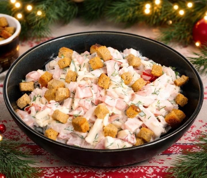 ИНГРЕДИЕНТЫ (на 3 порции): ✅ Ветчина — 250 г ✅ Сыр твёрдый — 100 г ✅ Помидоры — 2 шт. ✅ Чеснок — 2 зубчика ✅ Зелень — 1 пучок ✅ Сухарики — 50 г ✅ Майонез — по вкусу ПРИГОТОВЛЕНИЕ: 1. Ветчину нарезать соломкой и переложить в салатник. 2. Помидоры нарезать кубиками и добавить к ветчине. 3. Сыр натереть на крупной тёрке, чеснок мелко порубить или пропустить через пресс, добавить в салат. 4. Зелень мелко нарезать и высыпать к остальным ингредиентам. 5. Заправить салат майонезом и аккуратно перемешать. 6. Перед подачей посыпать салат сухариками, чтобы они остались хрустящими. ПРИЯТНОГО АППЕТИТА!