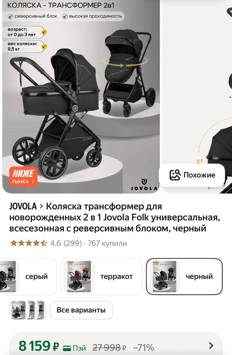 😴😃😲🤐Коляска трансформер для новорожденных 2 в 1 Jovola Folk универсальная, всесезонная с реверсивным блоком, черный
