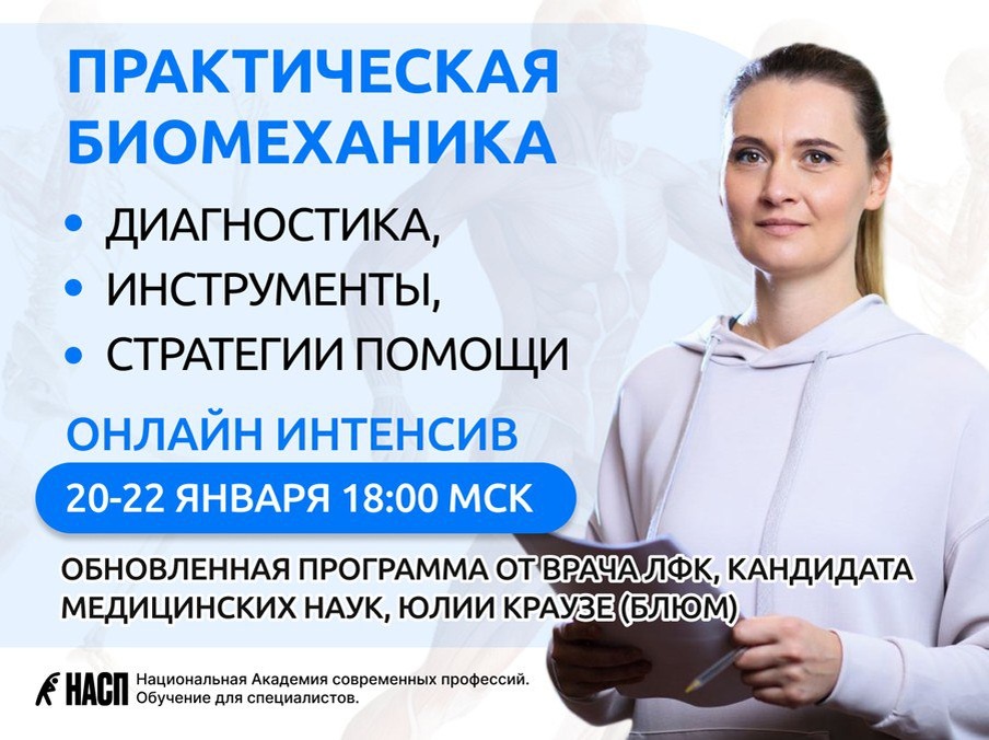 — какие компенсации включаются для сохранения функции. Когда специалист начинает учитывать эти параметры, диагностика перестаёт быть субъективной. Она превращается в структурированную модель, из которой напрямую вытекает стратегия коррекции — логичная, последовательная и безопасная для клиента. 20–22 января мы проводим обновлённый онлайн-интенсив по практической биомеханике — программу для специалистов, которые хотят работ