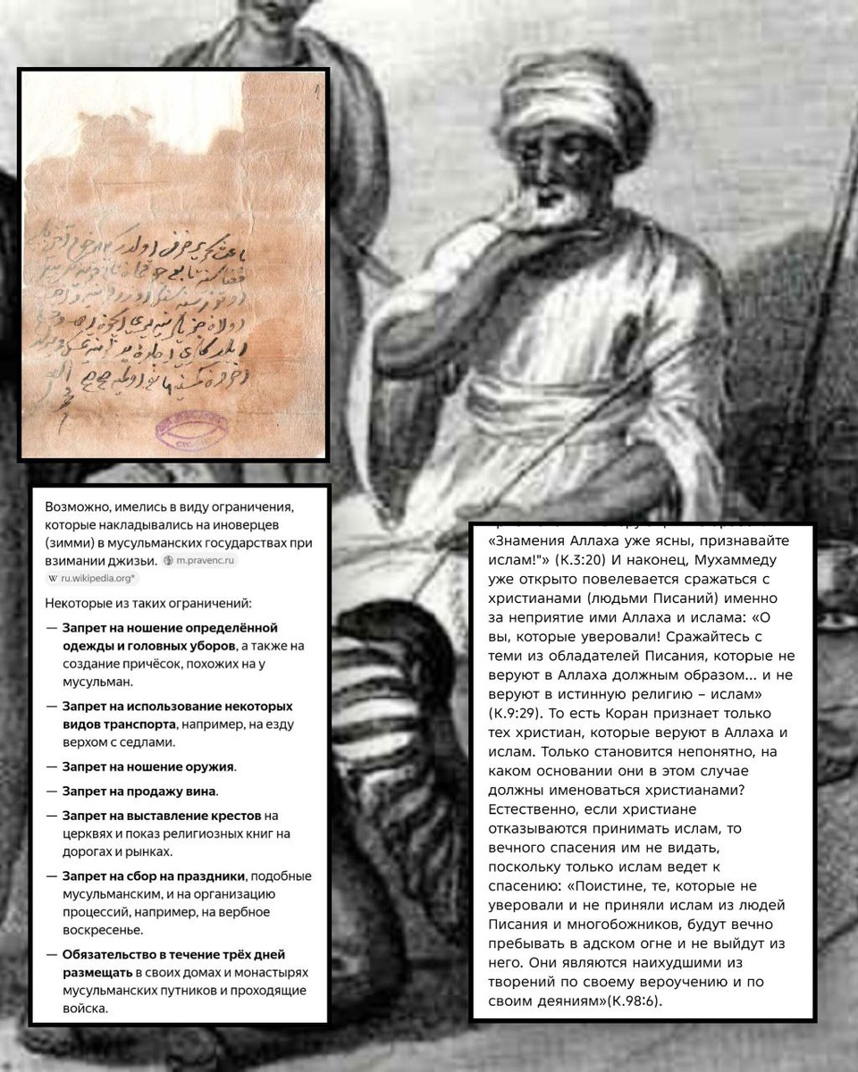 Только факты! Многие задают вопрос- если например не дай Бог мусульмане придут на наши земли и захватят, то как бы повел себя Хаджи-Мурат Г., наши муллы Осетии и вообще все осетины мусульмане по отношению к носителям традиционной Осетинской религии предков? ДЖИЗЬЯ (налог с неверных) Джизья или джизия (араб. جزْية), также харач — подушная подать с иноверцев (зимми) в мусульманских государствах. Исламские правоведы рассматривают джизью как выкуп за сохранение жизни и дальнейшую защиту от внутренних и наружных врагов при завоевании. От выплаты подати освобождались женщины, старики, инвалиды, нищие, рабы, монахи (до начала VIII века) и христиане, воевавшие в мусульманской армии. Термин джизья встречается в 29 аяте суры Ат-Тауба (9:29): «Сражайтесь с теми из людей Писания, которые не веруют ни в Аллаха, ни в Последний день, которые не считают запретным то, что запретили Аллах и Его Посланник, которые не исповедуют истинную религию, пока они не станут собственноручно платить дань, оставая