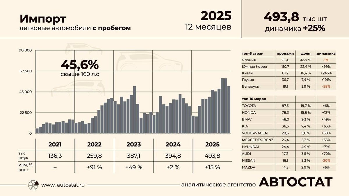 Что и откуда? ✅ ▫️ В 2025 году в Россию ввезли 493,8 тысяч легковых автомобилей с пробегом. Если к этому объему добавить 8,5 тысяч легких коммерческих авто с пробегом (LCV до 3,5 т), также ввезенных в 2015 году, то получится более полмиллиона единиц. ✅ Это абсолютный рекорд для нашего авторынка начиная с лихих 90-х годов. Тогда, на волне первой безудержной автомобилизации и отсутствия таможенных барьеров, пару лет тоже ввозили по полмиллиона машин. ✍️ Вернемся к импорту легковых в 2025-м. Почти 44% было ввезено из Японии. Более 99% этого количества с правым расположение руля. Хотя есть единичные автомобили и с левым. Головой объем в 215,6 тысяч это на 5% меньше, чем в 2024 году. ✅ Три других страны (Южная Корея, Китай и Грузия) показали огромный рост импорта. Из Кореи ввезли 110,7 тысяч авто с пробегов. Это в два раза больше (+99%), чем годом ранее. Ввоз подержанных авто из Китая (81,2 тыс) взлетел в 3,5 раза. Рост импорта авто с пробегом из Грузии тоже впечатляет (+191%). ✅ Вво