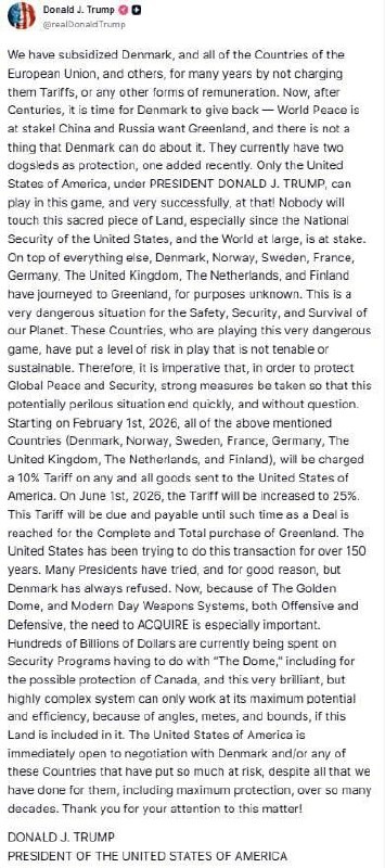 Дания, Норвегия, Швеция, Франция, Германия, Великобритания, Нидерланды и Финляндия будут обложены тарифом в 10% на все товары, поставляемые в США. С 1 июня 2026 года тариф вырастет до 25%, заявил Дональд Трамп. Пошлины будут взиматься до тех пор, пока не будет достигнута договоренность об окончательной и полной покупке Гренландии. Только США могут играть в эту игру и делать это успешно, — написал Трамп, добавив, что безопасность Соединенных Штатов и мира «поставлена на карту». Он также заявил, что США готовы к переговорам с Данией и другими странами, подчеркнув, что Гренландия, по его мнению, критически важна для глобальной безопасности и оборонных систем США.