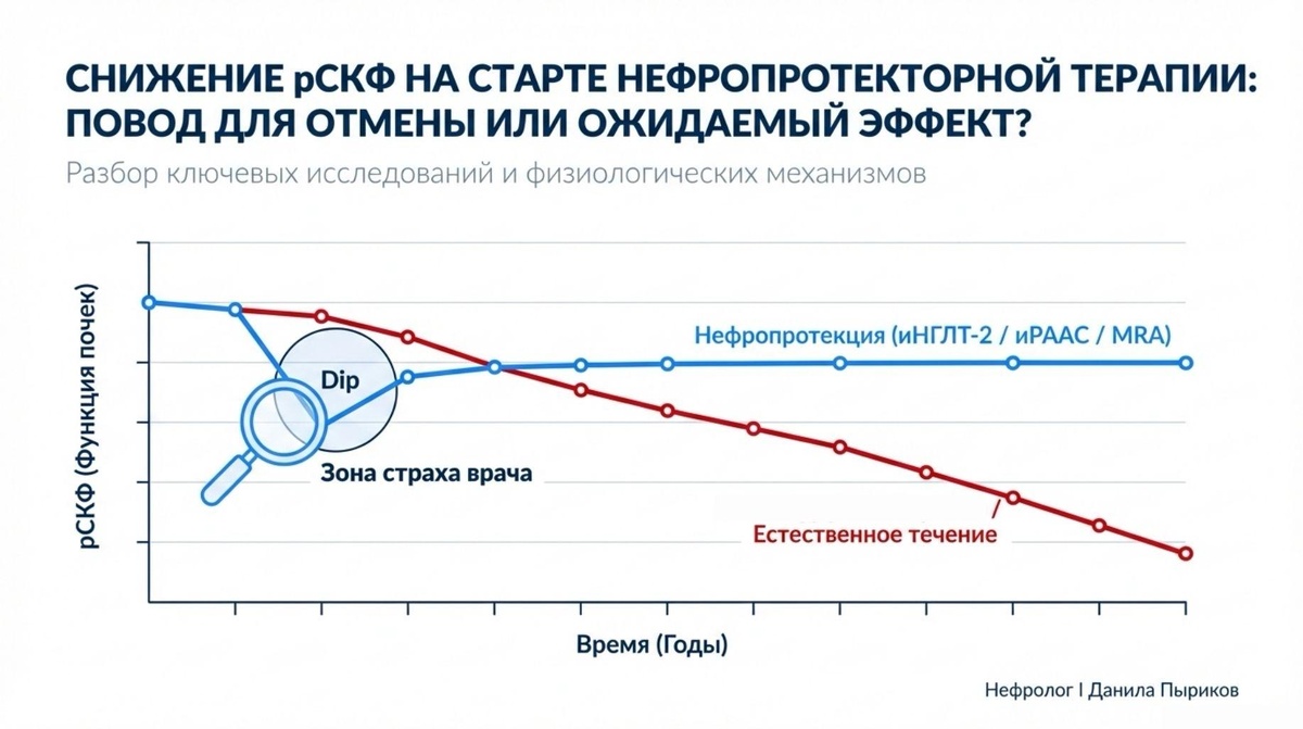 В слайдах рассказал про явление (на первый взгляд пугающее для врача и пациента), которое было описано при анализе ключевых исследований по нефропротекции