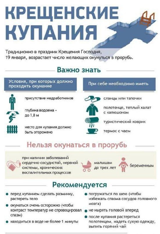 ❗️Перед купанием в проруби на Крещение обязательно проконсультируйтесь с врачом: процедура противопоказана при сердечно‑сосудистых, дыхательных, нервных, эндокринных, глазных, мочеполовых и других хронических заболеваниях, а также детям, беременным и пожилым. ✅Окунайтесь только в официально оборудованных купелях под присмотром спасателей. Перед погружением разогрейте тело разминкой. Подойдите к проруби в нескользящей обуви, которую легко снять. ✅В воду заходите постепенно, не ныряйте головой вперёд. Окунайтесь по шею, не замачивая голову, чтобы избежать спазма сосудов. Находитесь в воде не дольше 1 минуты. ✅При выходе из проруби используйте сухое полотенце или горсть снега, чтобы ухватиться за поручни. Сразу после купания вытритесь полотенцем, наденьте сухую одежду и выпейте горячий чай. ❌Категорически запрещено купаться в состоянии алкогольного опьянения, прыгать в воду, плавать под водой, заходить за ограждения или приводить с собой животных.
