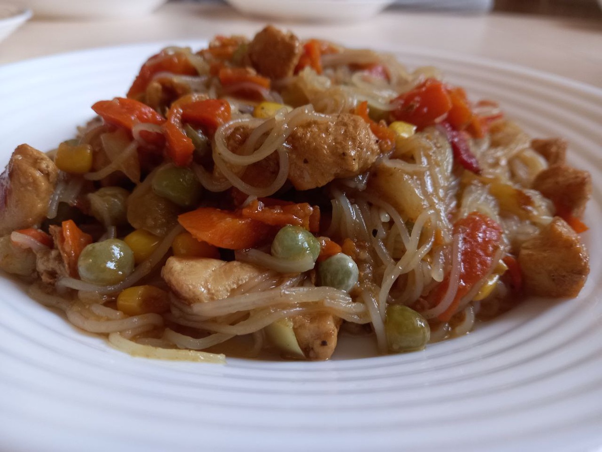 Фунчоза с курицей и овощами.