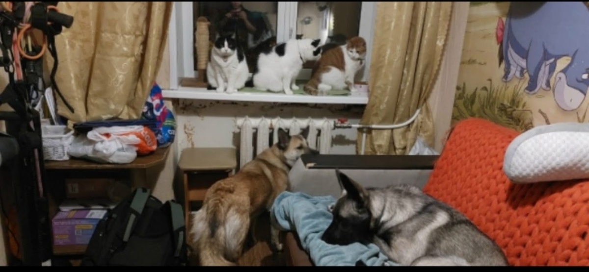 До приезда Вари и Карася у нас уже были 2 кота: Мудень и Орень , в апреле 2023 года к ним присоединилась собака из Якутии Нора, а в марте 2025 года мы спасли с улицы и приняли в нашу семью еще одну собаку : Цири. Так и живём теперь: мы с мужем, 3 кота, 1