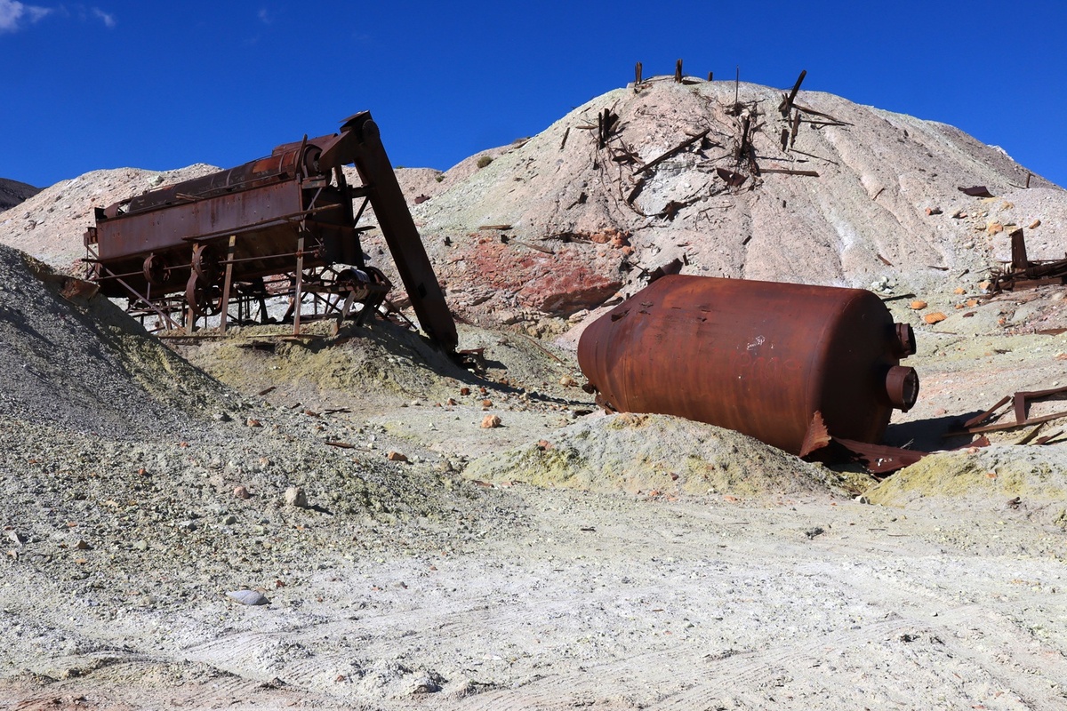 В этот раз никаких крюков. Я сразу поворачиваю на дорогу к «Скотти Кэстл» и держу в среднем 100 км/ч. После джипа сидеть за рулем мощного Форда сегодня одно удовольствие. За час мы доезжаем до вчерашнего кратера, хорошая дорога заканчивается и начинается грунтовка. Но она гораздо лучше вчерашней, так что я еду по ней 70 – 80 км/ч, игнорируя гребенку и неровности. После прямого участка начинается серпантин, и за очередным поворотом открывается довольно странное зрелище. Всем интересно, все идут изучать. Здесь явно добывали что-то зеленое или что-то розовое.