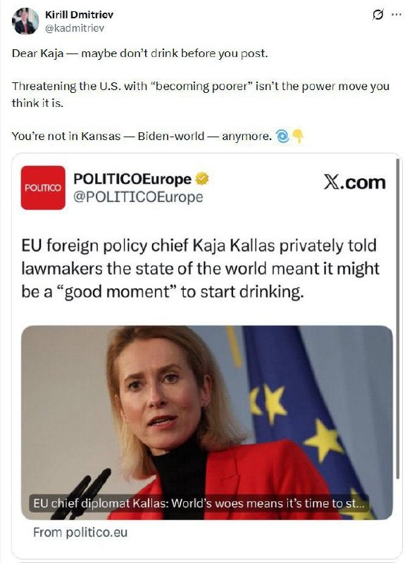 🇷🇺🇪🇺Дмитриев посоветовал Каллас не пить перед тем, как писать посты