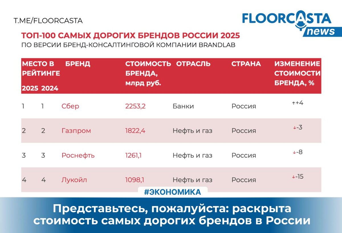 BrandLab представил рейтинг самых дорогих брендов России 2025, впервые с годовой динамикой 📈 💰 Совокупная стоимость топ-100 брендов страны достигла 18,8 трлн рублей (около 9,4% ВВП)! 💡 В рейтинг вошли 89 российских и 11 иностранных брендов. На отечественные компании приходится 96% совокупной стоимости списка. Новый рейтинг обновился на 15%: 15 компаний вошли в топ-100 и 15 его покинули. ⚡️ Лидеры рейтинга: Лидерство удерживает Сбер (+4%). Второе, третье и четвёртое места, как и год назад, за брендами нефтегазового сектора (Газпром, Роснефть, Лукойл), показавшими отрицательную динамику. ⚡️ Главные скалолазы: Рекордсменом роста в топ-100 стал Telegram (+175%). Феноменальный рост показали также Wildberries (+147%) и Золотое яблоко (+134%, с 73-го на 57-е место). DIY бренды в рейтинге ✅Лемана Про — место 41. Сильнейший дебют в категории 💪 ✅Hoff — место 89, динамика -9% 📄 Методология: оценка производилась по отраслевому стандарту ISO 10668 "Brand valuation" с использованием метод