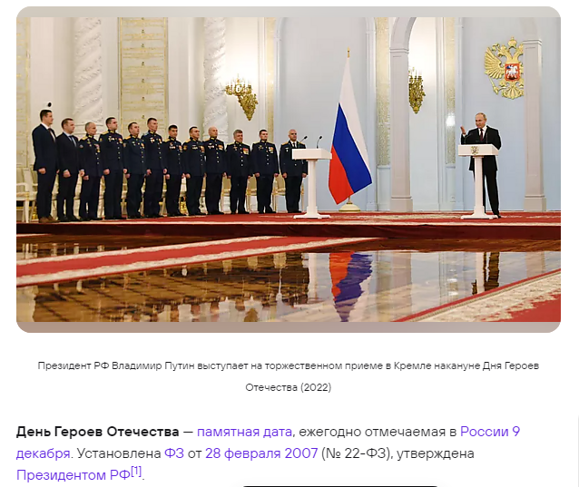 В этот день в 2007 году в Москве был открыт первый в России Музей Героев Советского Союза, Героев Российской Федерации и полных кавалеров орденов Славы. 9 декабря (26 ноября по старому стилю) 1769 года российская императрица Екатерина II учредила высшую воинскую награду — Императорский Военный орден Святого Великомученика и Победоносца Георгия. В честь этого события в Российской империи появился праздник — День кавалеров ордена Святого Георгия. Памятная дата приурочена к празднику Российской империи — Дню Георгиевских кавалеров, который отмечался с 1769 по 1917 годы. В 2000 году орден Святого Георгия восстановлен в качестве военной награды Российской Федерации. Орден Святого Георгия выделялся своим статусом среди других российских орденов как награда за личную доблесть в бою, и заслуги, за которые офицер мог быть удостоен награды, строго регламентировались статутом ордена. Дата учреждения26 ноября (7.XII) 1769, восстановлен 20 марта 1992 года[1], статут утвержден 8 августа 2000 года.