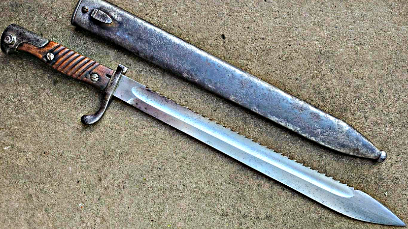 Речь идёт об одном из вариантов ножа-штыка, созданного для карабинов Маузера начала XX века. К 1914 году Германия активно модернизировала пехотное вооружение: штыки укорачивали, делая их более манёвренными, упрощали конструкцию, ускоряли выпуск. Война требовала массовости.