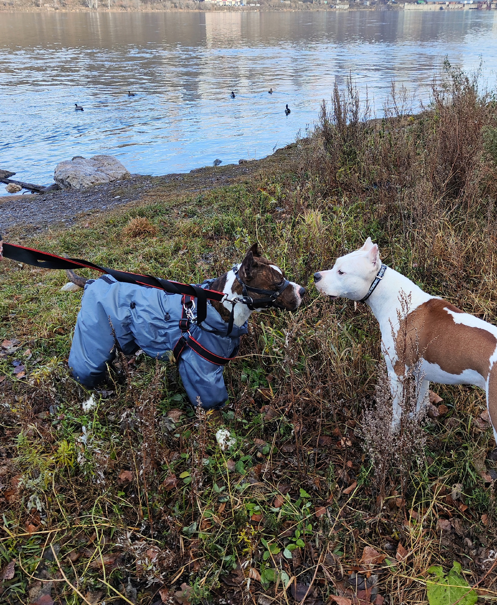 Вдруг замечаю: сверху спускается девушка с американским стаффордширским терьером. Пёс мощный, азартно тянет поводок вниз, к реке. Мы решили не проходить мимо, а познакомиться.