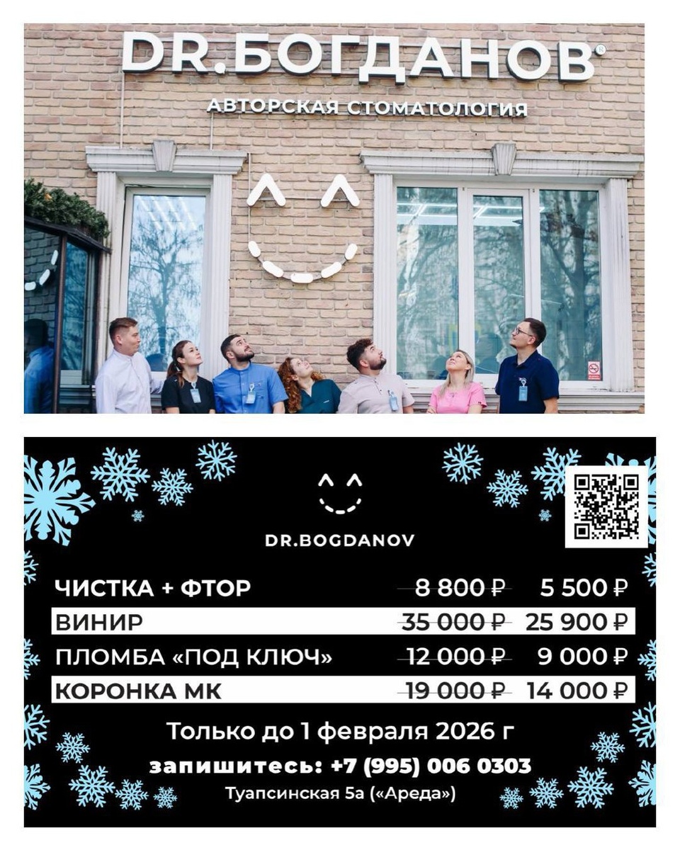 ! Специально для подписчиков @dr_bogdanov действуют особые условия с выгодой до 33%: • профессиональная чистка (4 этапа) — 5.500 ₽ (вместо 8.800 ₽); • пломба под ключ — 9.000 ₽ (вместо 12.000 ₽); • керамический винир — 25.900 ₽ (вместо 35.000 ₽); • металлокерамическая коронка — 14.000 ₽ (вместо 19.000 ₽). Предложение действует до 1 февраля 2026 года. Почему выбирают DR.БОГДАНОВ®: • лечение с вниманием к деталям под профессиональным микроскопом или бинокулярами — результат на годы; • современные технологии и авторские методики подготовки — без боли, страха и стресса; • нетравматичные удаления с применением хирургического ультразвука; • полностью цифровой формат: 3D-сканер и ультраточные слепки для идеальной посадки; • личный контроль лечения главным врачом на всех этапах. 📞 Запишитесь: +7 (995) 006-03-03 или онлайн на drbogdanov.site и получите кешбэк с первого визита. Сочи, ул. Туапсинская, 5а (мкр-н Ареда) DR.БОГДАНОВ® — авторская стоматология, где точность медицины сочетается