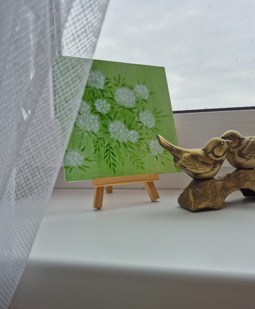 Перед нами небольшая картина размером всего лишь 15×15 сантиметров, выполненная в лаконичной манере, которая приковывает взгляд своей простотой и чистотой восприятия.