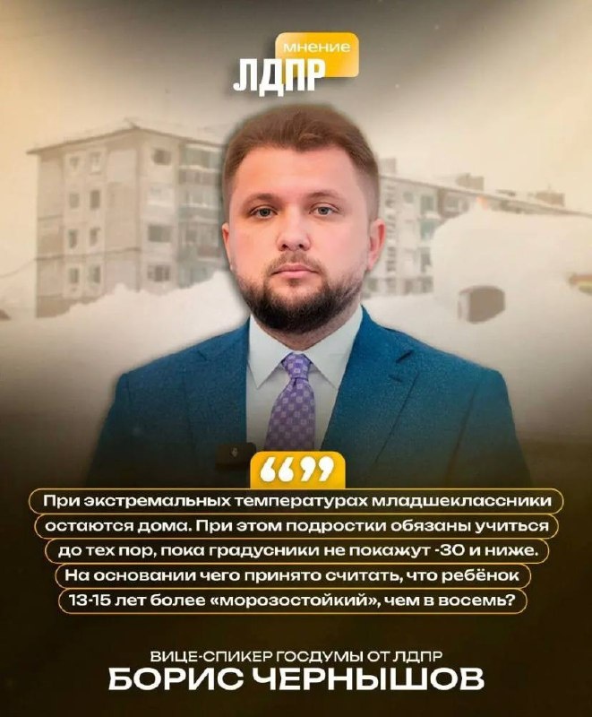 установить единый порог температуры для отмены занятий в школе Настоящая русская зима пришла во многие регионы, но при всей её красоте из-за трескучих морозов и ветров школьники по всей России нередко болеют. Вице-спикер Госдумы от ЛДПР Борис Чернышов заметил, что при экстремальных температурах младшеклассники остаются дома, а подростки обязаны учиться, пока градусники не покажут -30 и ниже. Разве ребёнок в 13-15 лет более «морозостойкий», чем в восемь? «Отдельная боль — учителя, которые вынуждены приходить на рабочее место, даже если весь класс остался дома. Обратился в Минпросвещения с предложением ввести для каждого региона единый безопасный температурный порог для отмены очных занятий для всех школьников. Стандарт должен быть принят на месте: очевидно, что -20 в Санкт-Петербурге с его влажностью и -20 на Урале ощущаются по-разному. Кроме того, предлагаю разрешить педагогам работать дистанционно в такие дни, не рискуя здоровьем по пути в пустое здание школы», — сказал Борис Черныш