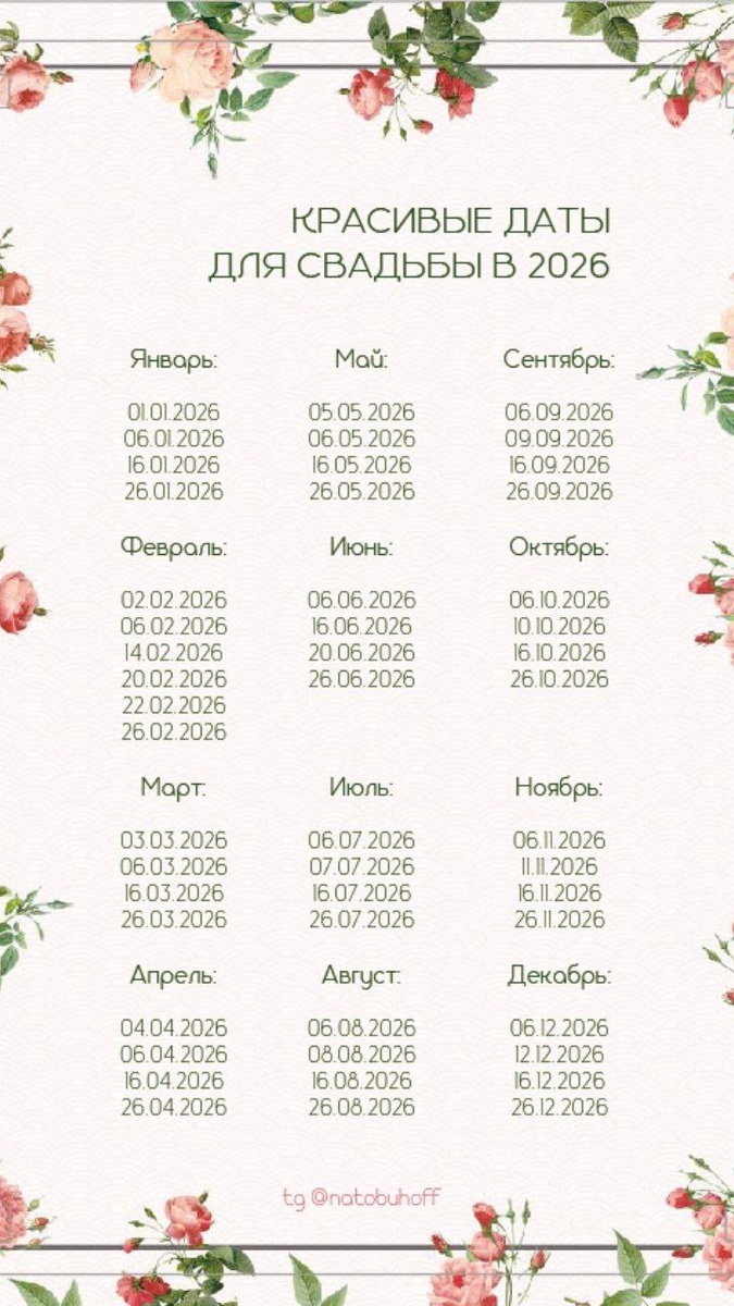 ! 🗓️✨ Смотрите, какая сочная подборка красивых чисел: от идеально ровных до романтичных повторов. Выбирайте ту, что отзовется в вашем сердце, а я помогу превратить эту дату в самый гармоничный и радостный праздник вашей жизни! Пишите, какую дату присмотрели? 😉 #ВедущаяНадеждаКотоvа #Свадьба2026 #КрасивыеДаты #ИдеальнаяСвадьба