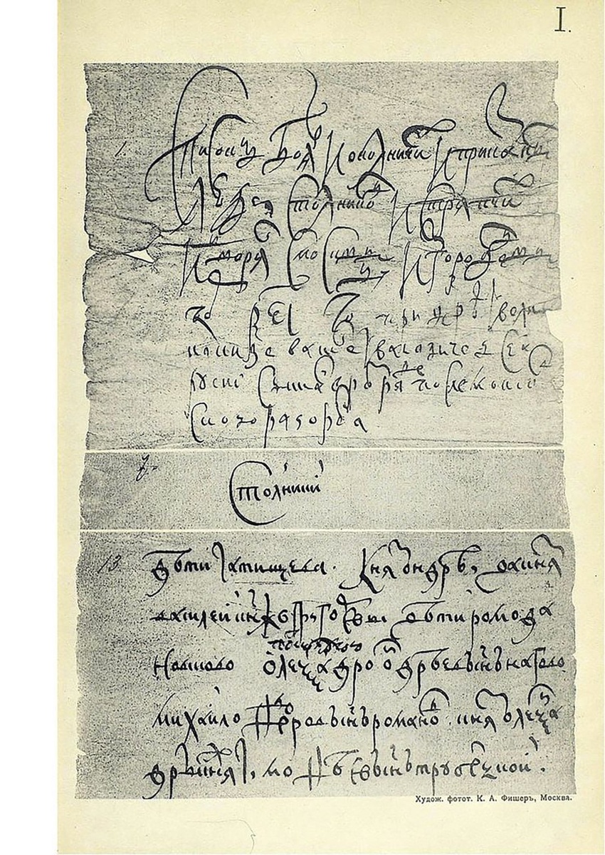 Вот так выглядел документ, означавший для русских людей завершение Смутного времени. Это грамота об избрании на Московское царство Михаила Федоровича Романова. Что думаете? Соответствует стереотипному представлению о «древнерусском шрифте»? Нет? А все потому, что это так называемая «скоропись»: особый почерк, выработанный как раз для составления документов. Первые древнерусские книги были написаны «уставом». Это крупный, торжественный почерк с четко разделенными ровными буквами без пробелов между словами. Его было легко читать, но очень сложно писать. Постепенно книгописцы начали «мельчить», буквы стали кругленькими и приобрели наклон: так намного проще и быстрее. Получился «полуустав». Но все же в книгах, которые писали на дорогом пергаменте – телячьей коже особой выделки – почерк всегда оставался таким, чтобы его заведомо разобрать каждый читатель. Но жизнь не стояла на месте. Развивался государственный аппарат, появлялись все новые учреждения – «приказы», а в них – профессиональны