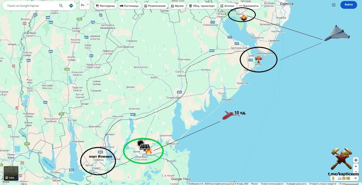 Ночью около 10 ударных БпЛА "Герань" прилетели по объекту энергетики в районе дунайского порта Килия(зеленый овал).