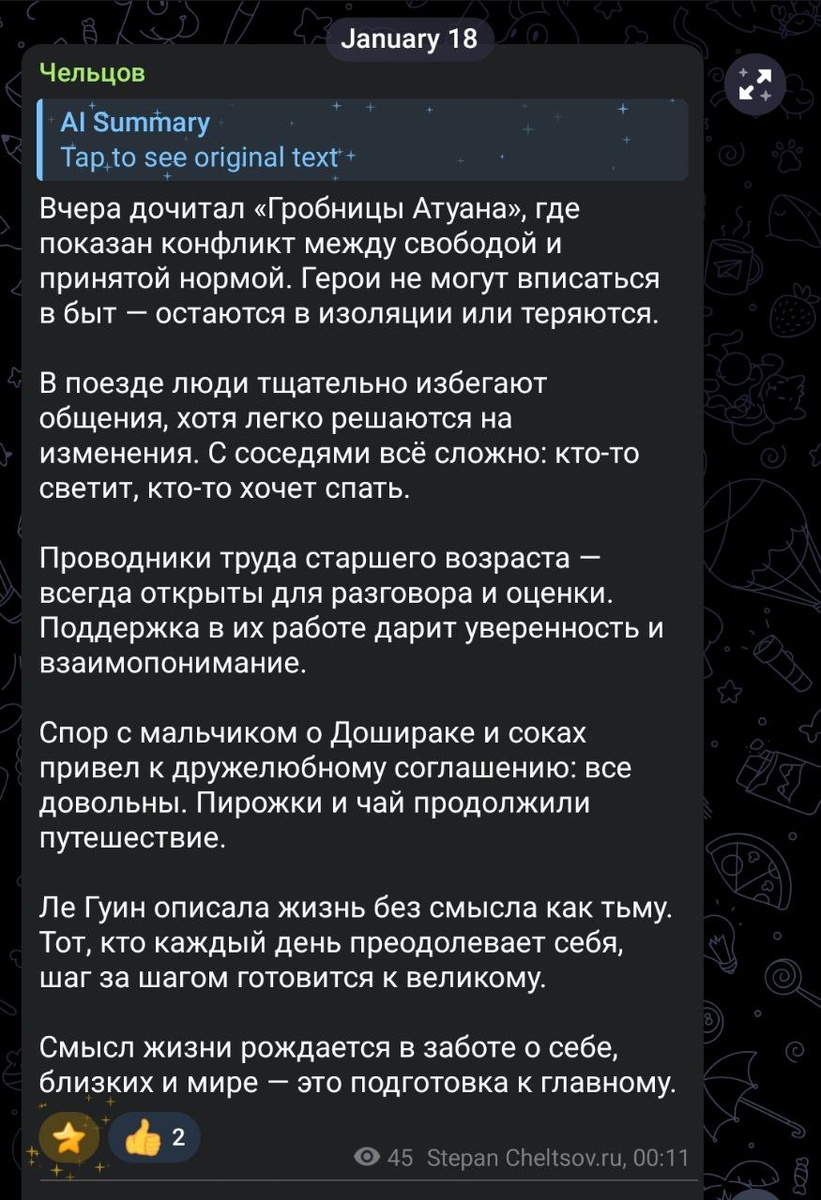 Новая фича суммаризации поста совершенно никак не передала смысл поста. Смешало коней и людей. Единственное, мне понравилось, как "чай и пирожки продолжили путешествие", полезный прикол.
