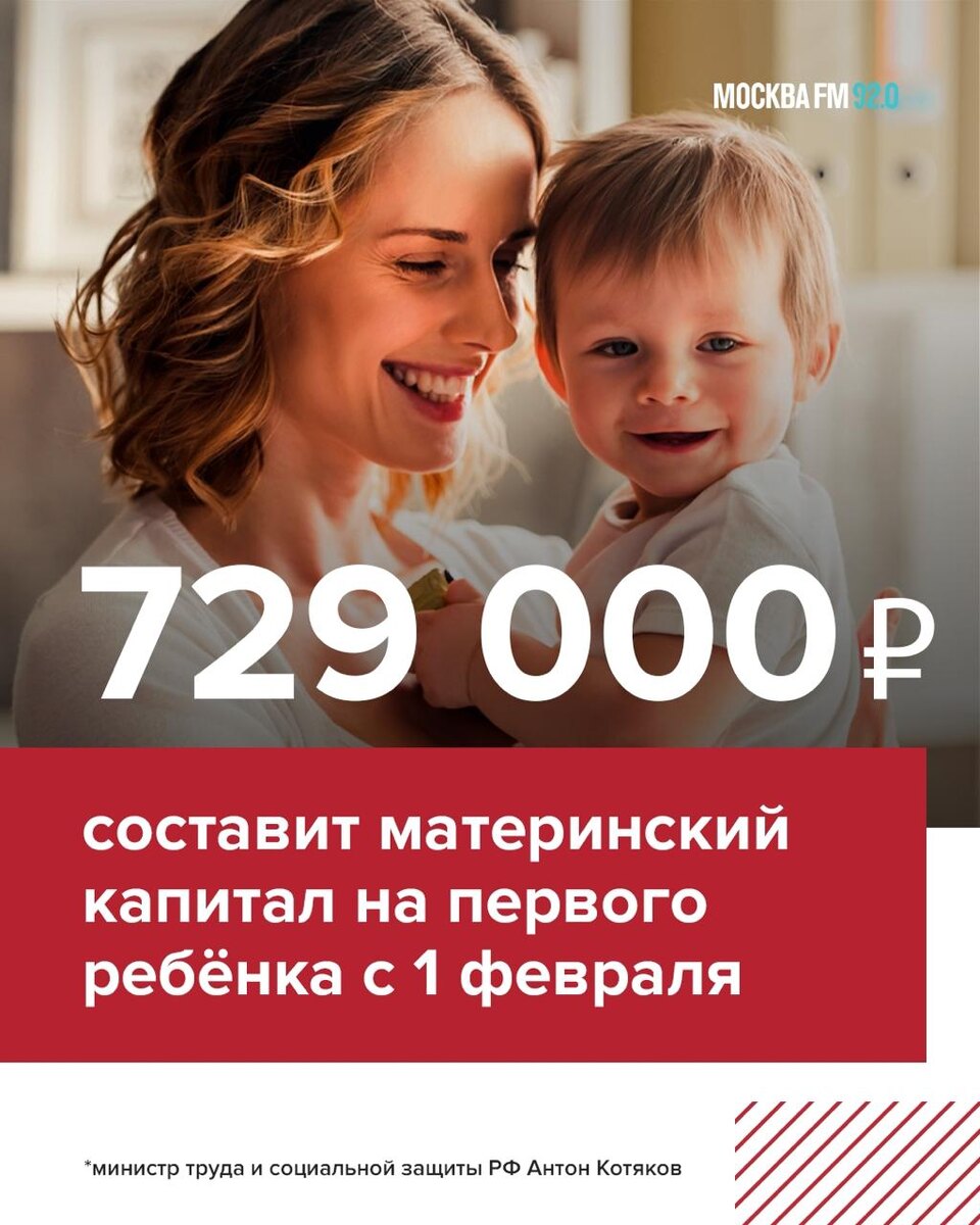 👶 Маткапитал на первого ребёнка вырастет на 38 000 ₽ с 1 февраля и составит 729 000