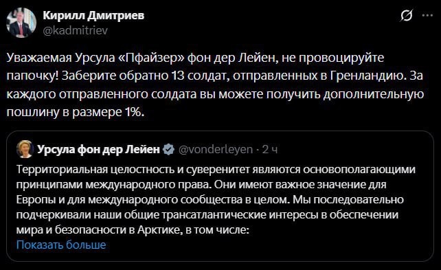 Уважаемая Урсула «Пфайзер» фон дер Ляйен, не провоцируйте папочку! Заберите обратно 13 солдат, отправленных в Гренландию.
