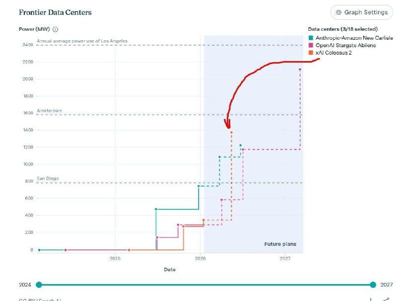 И это только старт - уже в апреле мощность увеличат до 1.5 ГВт. Мы видим новый тренд: AI-дата-центры превращаются в энергопотребителей масштаба города, причём по скорости роста это больше похоже на релиз софта, чем на строительство тяжёлой инфраструктуры. Чтобы почувствовать масштаб: 1 ГВт - это примерно половина всего энергопотребления Лос-Анджелеса. И xAI не единственные - hyperscaler’ы массово переходят к “гига-уровню”: OpenAI - строит Stargate в Milam County (Техас) мощностью 1.2 ГВт - партнёрство с SB Energy на $1B - строительство начинается уже сейчас - запуск по фазам - начиная с 2026 года Anthropic - стартовая фаза: 245 МВт совместно с Hut 8 и Fluidstack - предусмотрено масштабирование до 2.295 ГВт на нескольких площадках - развёртывание будет идти несколько лет https://x.com/elonmusk/status/2012500968571637891