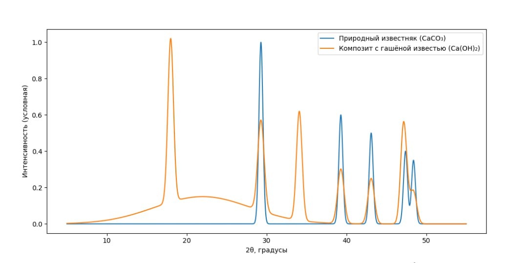 процесс изготовления камня был технологическим, а не природным!!! Как гашёная известь выглядит в РФА (рентгенофазовом анализе) Гашёная известь — кристаллическая фаза, и она обязательно проявляется на дифрактограмме. Характерные пики Ca(OH)₂ (портландита): Основные диагностические максимумы: 2θ ≈ 18,0° → самый важный признак 2θ ≈ 34,1° 2θ ≈ 47,1° слабые — около 50–51° 👉 Пик ~18° — ключевой. Если он есть — в образце точно присутствует Ca(OH)₂. На графике (дифрактограмме) появились бы новые пики: возник бы выраженный пик около 18° 2θ, добавились бы пики ~34° и ~47°, часть кальцитовых пиков могла бы ослабнуть. ❗️ В вашем анализе пика около 18° НЕТ — это очень сильный аргумент. Изменился бы фон (очень важно) Композит с гашёной известью почти всегда содержит: воду (связанную и адсорбированную), карбонизирующиеся продукты, плохо кристаллизованные фазы. Это дало бы: повышенный аморфный фон, «размытую» область 15–30°, менее чёткие пики. В вашем образце фон ровный и низк