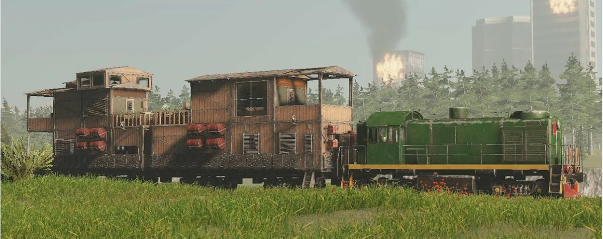 В каких то играх других нам дают например машину и напарников ботов, как в State of Decay 1,2. Разработчик Zompiercer решил сделать оригинально: из машины он сделал поезд, а в напарники дал робота которого можно так же модернизировать (поставить на него можно ящики для лута или разнообразные турели).