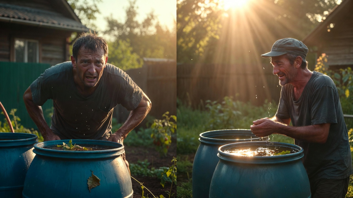 Надел шорты, старую футболку. Вышел во двор. Под ногами трава ещё мокрая от росы, босиком приятно идти. Направился к бочкам — у меня их три штуки стоит, синие такие, двухсотлитровые. Под водосток поставил ещё весной. На прошлой неделе как раз ливень хороший был, так они все до верху наполнились. Вчера специально проверял — полные стояли, даже листья с тополя на поверхности плавали.