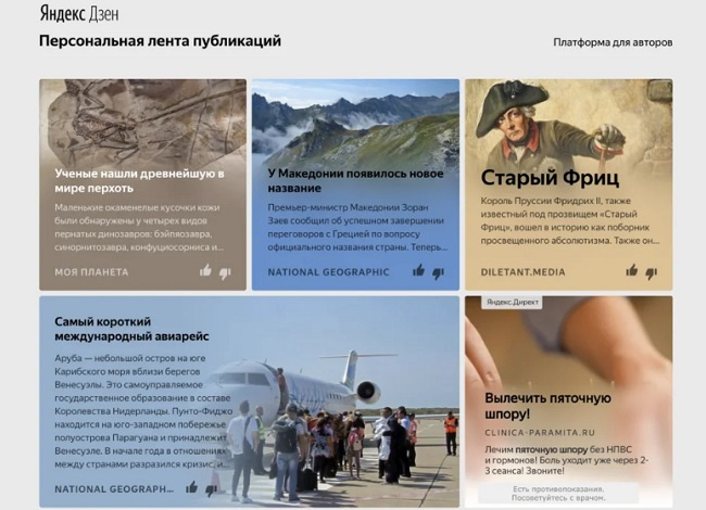 Итак, приступаю непосредственно к программированию сайта. Первым делом надо разработать макет главной страницы. С одной стороны – необходимо, чтобы он был функциональным, но с другой стороны – не хочется, чтобы он получился перегруженным. Надо что-нибудь простенькое и лаконичное без вычурных излишеств. Главную страницу сайта я планирую сделать как рекомендательную ленту из публикаций, а также инструментами регистрации и авторизации. Кстати, а вы помните, как раньше выглядела рекомендательная лента Яндекс.Дзена? Увы, у меня нет скринов ленты, но я нашёл их в Тырнете: Открывая новую вкладку в Яндекс.Браузере, под плашками избранных сайтов ниже шла рекомендательная лента. В 2018-19 гг. лично я заходил на неё почитать две-три статьи и... залипал на два-три часа. Три квадратных блока, ниже шли один широкий блок и один квадратный, в котором обычно располагалась реклама Яндекс.Директа. Ненавязчиво и ничуть не бесила. Затем опять шли три блока в ряд и ниже вновь широкий блок, но уже с другой с