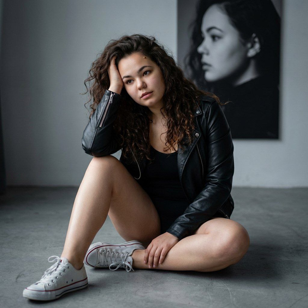 , поддерживающей голову. Она в черном облегающем костюме и матово-глянцевой кожаной куртке с молниями на рукавах и лацканах, стильная бунтарская нотка. На ногах светлые белые кеды с тонкой красной полосой по подошве, контрастирующие с темным нарядом. Волосы темно-каштановые, длинные, кудрявые и объемные, уложены для эффекта движения. Взгляд чуть в сторону камеры, теплый, задумчивый, передающий сочувствие и силу. Мягкий свет под углом акцентирует текстуру кожи и тени по лицу и одежде. На фоне крупный черно-белый портрет того же человека в профиль, добавляющий драматичности и художественности глубоким контрастом и светотенью. Атмосфера в холодных сдержанных тонах с серыми стенами, усиливающими ощущение уединения. Мягкое освещение, приглушённые цвета, контраст с черно-белым фоном создают кинематографическую глубину, холодную элегантность и лаконичный стиль, фотореалистичный, высокая детализация, 8K. #промты #женские