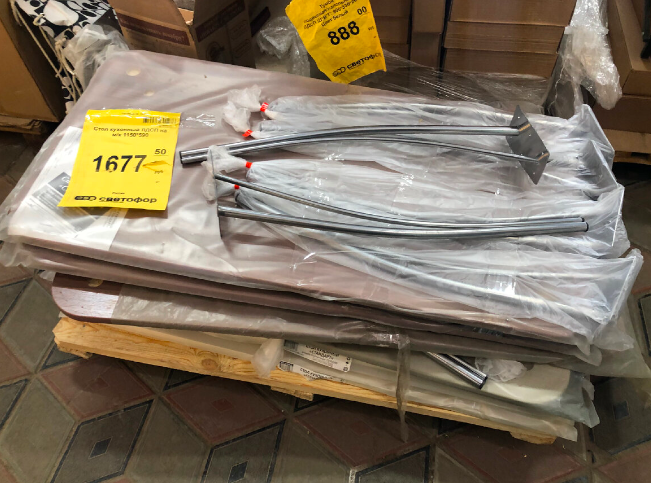 Начну с товаров для кухни и дома. В продаже появился кухонный стол на устойчивых металлических ножках со столешницей из ЛДСП. Представлен в двух спокойных оттенках — коричневом и молочном, поэтому легко впишется в большинство интерьеров. Размер стола 115×59×89 см, производство российское, город Ижевск. Цена более чем доступная — 1677 рублей.