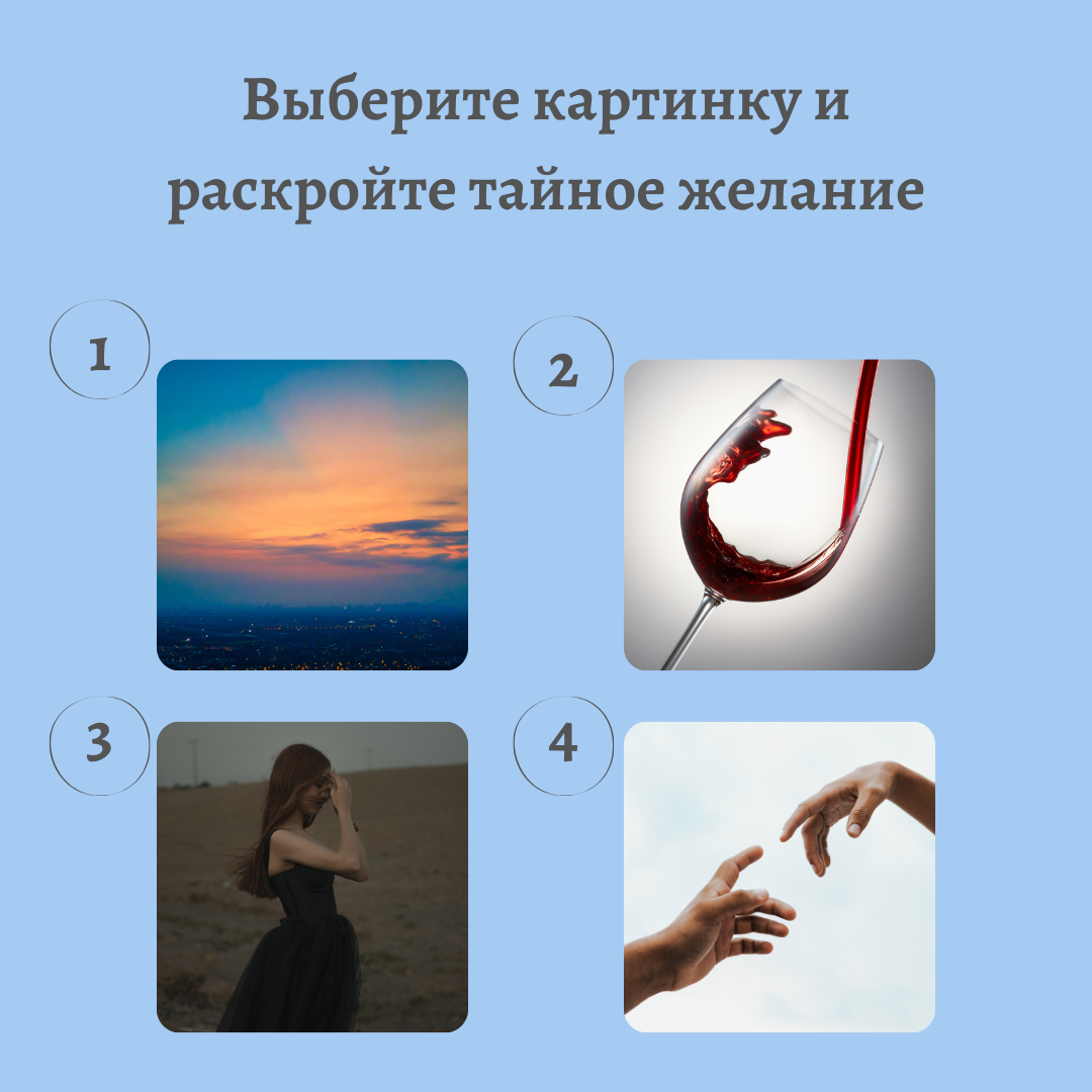 Не думайте долго. Выбирайте ту, что нравится на данный момент больше всего. Делитесь в комментариях, что выбрали! 🙊 Картинка 1 Ваше скрытое желание - покой и забота о себе. Часто отдаете больше, чем получаете, и внутри есть потребность, чтобы о вас позаботились без просьб. Позвольте себе то, в чем давно отказывали - это принесет лучшее в вашу жизнь. Картинка 2 Ваше желание - страсть и яркие эмоции. Рутина утомляет, хочется огня, спонтанности и ощущений "как в кино". Уже давно пришло время перемен, не отказывайтесь от предложений и новых возможностей - они приведут вас туда, где вы давно мечтаете оказаться. Картинка 3 Ваше желание - свобода быть собой. Без масок, ожиданий и рамок. Чтобы вас принимали полностью - настоящую/настоящего и такими, какие вы есть. Время научиться слушать себя и выйти из старого окружения, которое давно тянет вниз. Картинка 4 Ваше желание - глубокая близость. Не поверхностные связи, а кто-то, кто видит вас по-настоящему и остается рядом. Только когда поверите,