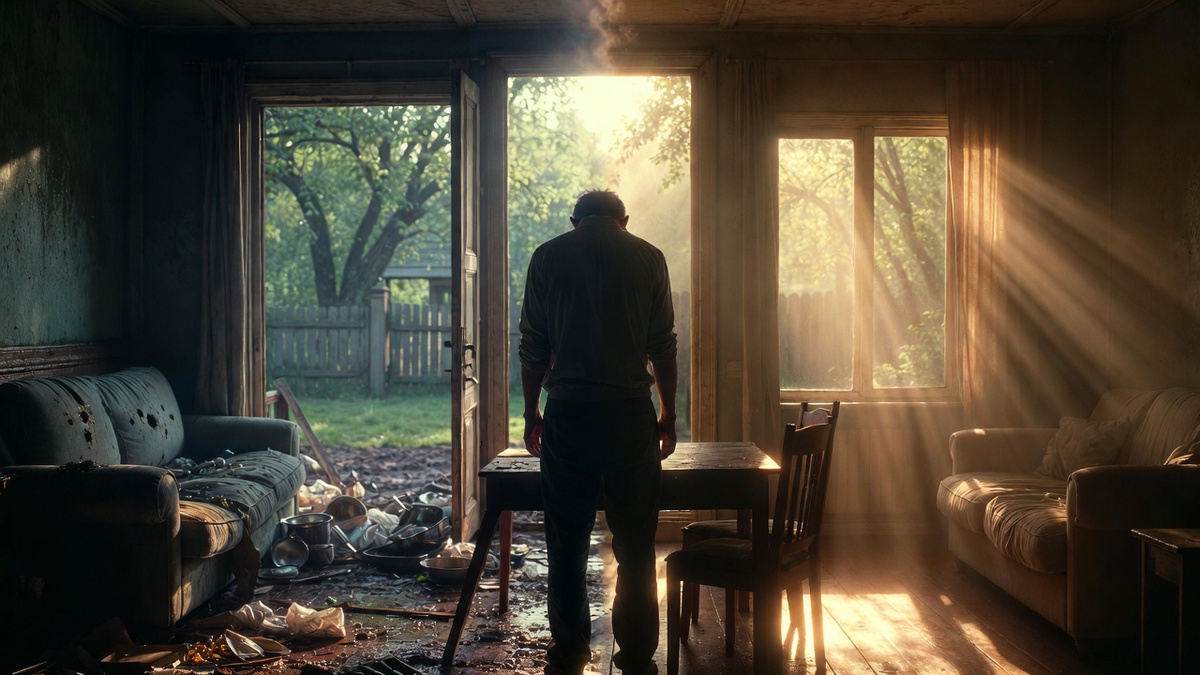 Стол мой обеденный — на трёх ножках стоит. Четвёртая лежит рядом, отломана. На столе грязная посуда. В раковине гора тарелок немытых, кастрюля какая-то. Плита вся в потёках — то ли суп убежал, то ли ещё что. Пол липкий. Наступил — ботинок прилип.