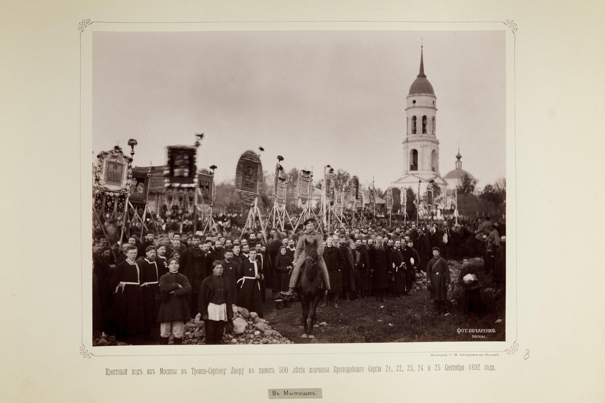 Крестный ход 1892 года. Мытищи были участником важного исторического события, проходившего 21-25 сентября 1892 года, в честь 500-летия со дня преставления игумена земли русской - Сергия Радонежского. Тогда состоялся грандиозный, небывалый по длительности и числу участников крестный ход из Московского Кремля в Cвято-Троицкую Сергиеву Лавру. В начальном шествии приняло участие половина тогдашнего населения Москвы, около полумиллиона человек. Когда голова колонны под звон колоколов входила в село Алексеевское, хвост ещё не покинул пределов столицы, проходя через Крестовскую заставу. Пятидневный паломнический маршрут прошли не все, но около 300 тысяч верующих со всей России растянулись на несколько километров по Троицкой дороге, и каждая церковь по пути приветствовала паломников своим благовестом. 22 сентября в 5 часов вечера крестный ход вступил в село Большие Мытищи. Возглавлял его на коне вице-губернатор Л.А. Боратынский. Центральная улица села была переполнена народом и усыпана песком