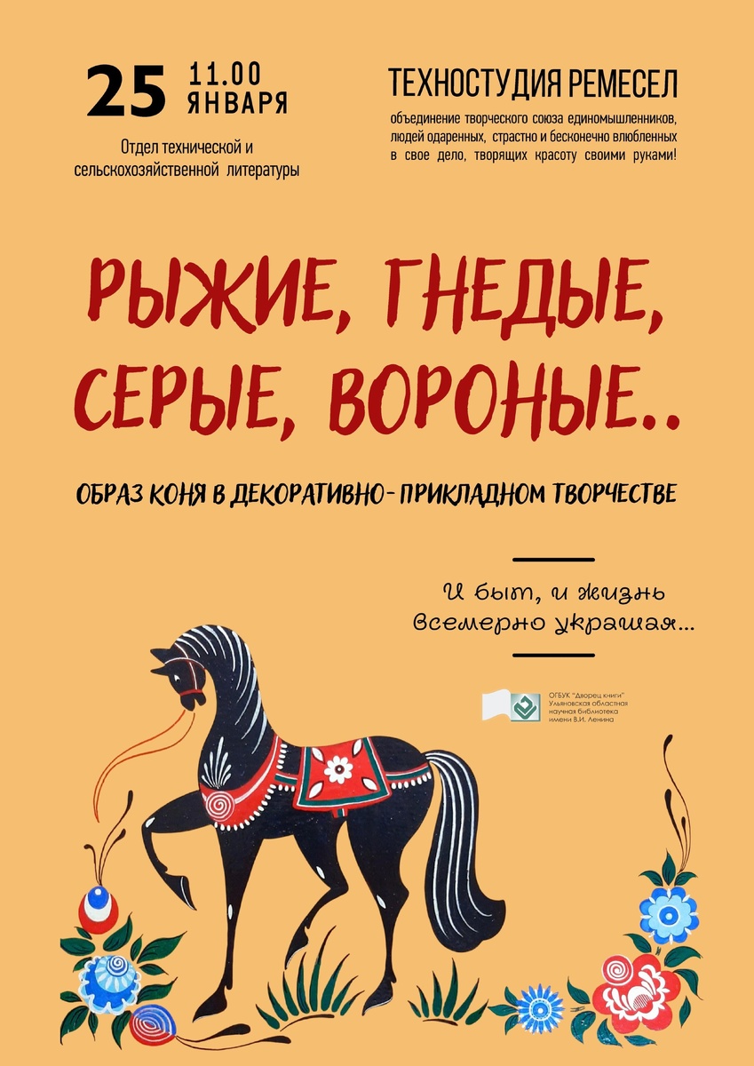 », посвященное образу коня в декоративно-прикладном творчестве. 📍 На январском занятии рукодельницы узнают, как представлен образ коня в прикладном искусстве народов России: в росписи, объёмной резьбе, керамической игрушке, художественном металле, народной вышивке. 🐴 Образ лошади продолжают использовать и современные рукодельницы. Участники встречи обменяются личным опытом, а также познакомятся с литературой о декоративно-прикладном творчестве из фондов Дворца книги. 📞 Вход свободный. Справки по телефону: 8(8422) 44-31-04, отдел технической и сельскохозяйственной литературы Дворца книги. Подробности - на сайте: https://clck.ru/3RKqqW #ДворецКниги_афиша