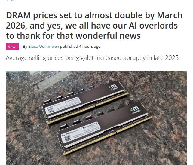 Индустриальные аналитики прогнозируют крупный рост цен на оперативную память. Citibank резко пересмотрел прогноз: 📈 теперь ожидается рост цен на DRAM в 2026 году на +88% (раньше прогнозировали **+53%**). Почему так: Micron прямо заявляет, что дефицит DRAM сохранится даже после 2026. Даже с запуском новых фабрик компания считает, что сможет закрыть только 50% - 66% спроса клиентов. Главный драйвер - AI. ИИ-сервера и ускорители сжирают память тоннами, и это вытесняет обычный рынок. Дополнительный фактор: производители памяти переводят мощности на более прибыльные AI/Server чипы, создавая “искусственный дефицит” обычной DRAM и NAND, которые идут в: - ПК - ноутбуки - телефоны - бытовые гаджеты Итог для пользователей: производители ПК уже предупреждают - в 2026 году розничные цены могут вырасти на +15% - 20%. https://x.com/Beth_Kindig/status/2012612262767321271