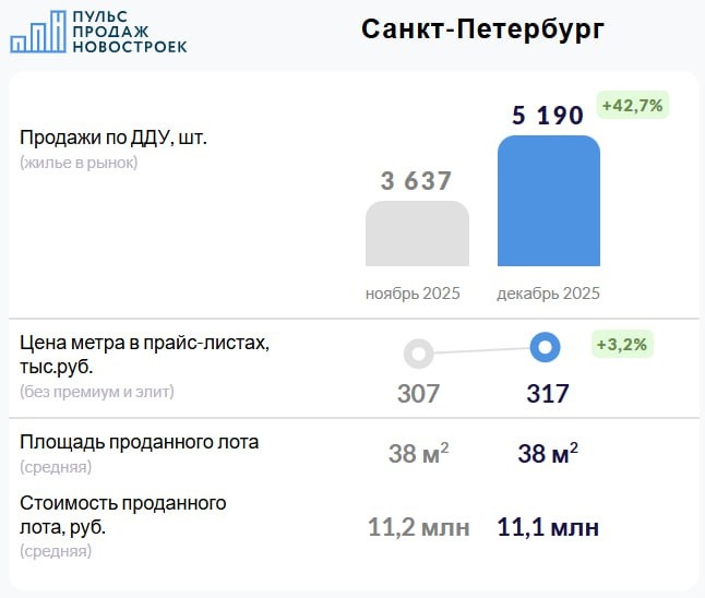 Декабрь 2025. Итоги продаж по ДДУ. 🏙 Сделки 5 190 сделок по ДДУ в декабре 2025 (+42,7% за месяц). 💰Цены и предложение На конец декабря средняя цена метра составила 317 тысяч рублей (+10 000 рублей за метр, без премиум и элит сегментов). На начало января (на сегодня) средневзвешенная цена метра растёт, 318 тысяч рублей. 🔸Цена метра в сделках с ДДУ выросла до 286 тысяч рублей (+4 тыс. рублей, +1,5%). Средний бюджет покупки ниже предыдущего месяца, в среднем 11,1 млн рублей за лот (-0,1 млн за месяц). Средняя площадь проданного по ДДУ лота в декабре - 38 м² (без изменений). 📈 Доля ипотечных сделок 68,0% (в ноябре было 60,0%). Смотрите детальные графики, топ девелоперов и старты продаж декабря на нашем сайте https://pulsprodaj.ru/news/dekabr-2025-sankt-peterburg/ 🔥 @pulsprodaj