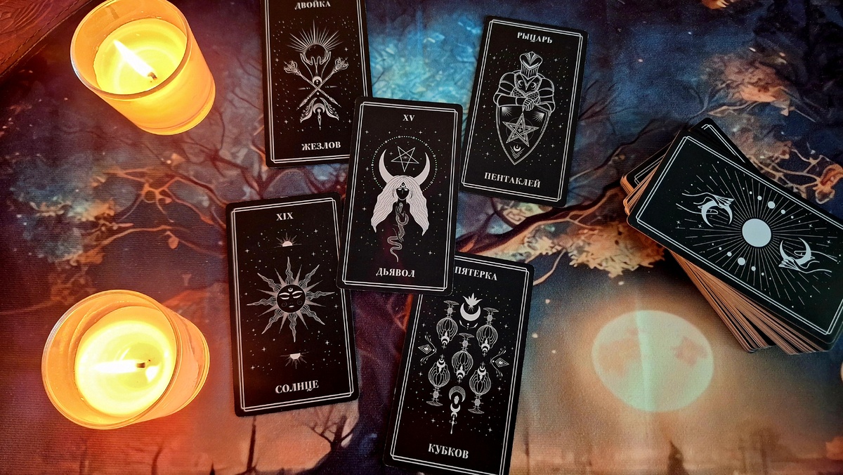 Расклад выпал сложный, тягучий, пропитанный страстью и горечью: Двойка Жезлов, Солнце, Рыцарь Пентаклей, Пятёрка Кубков, а в центре всего - Дьявол.