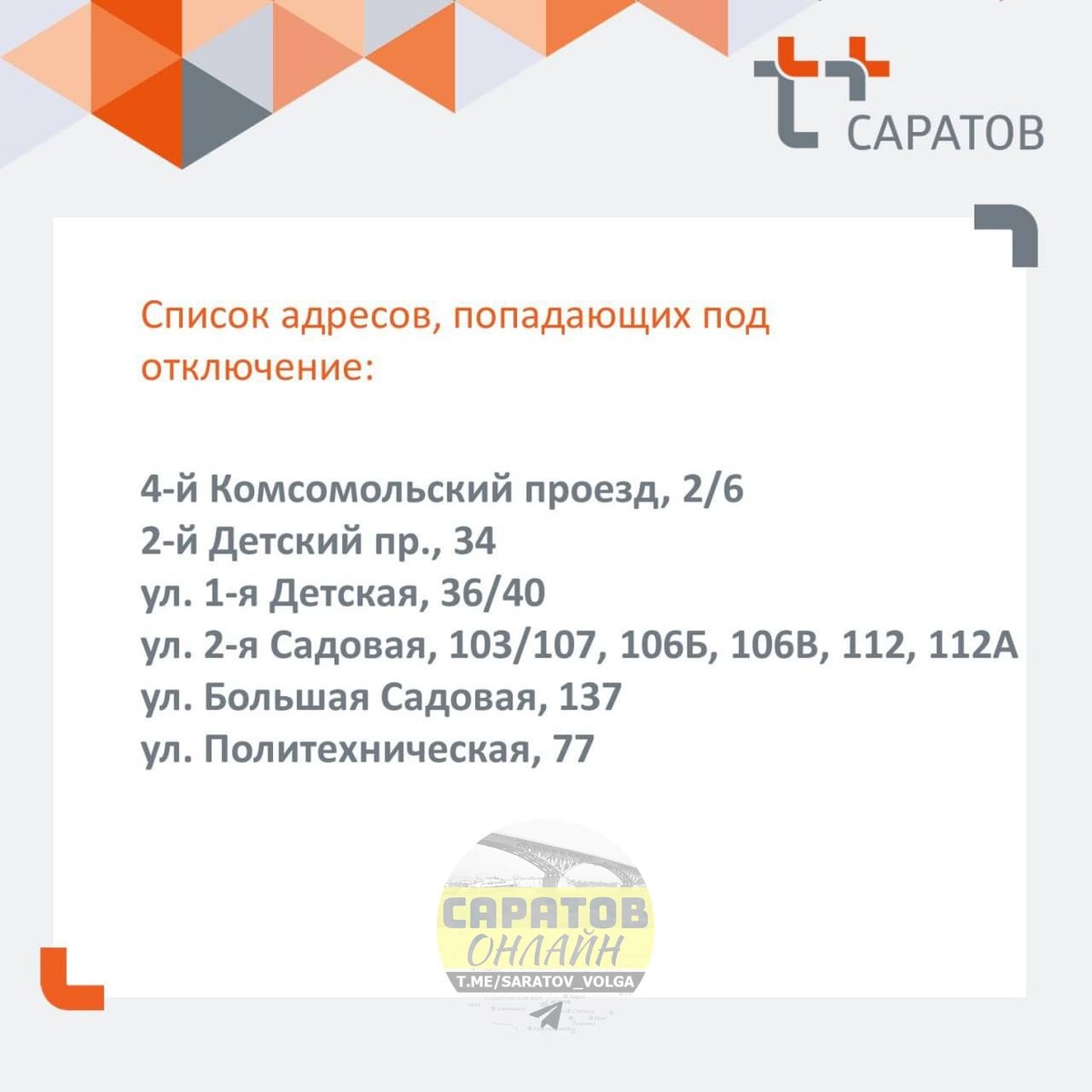 В Саратове из-за повреждения на теплосети пришлось временно отключить подачу тепла и горячей воды в ряд домов, сообщает "Т Плюс". В ходе осмотра теплосетей специалисты обнаружили повреждение на трубопроводе на ул. 2-й Садовой. Чтобы не допустить серьезной аварии, необходимо провести ремонт сейчас. Специалисты будут трудиться без перерыва. Завершить ремонт мы планируем до 02:00 19 января", — пояснили энергетики. ▫️САРАТОВ ОНЛАЙН ▪️ЭНГЕЛЬС ОНЛАЙН 📲 Мы в мессенджере MAX