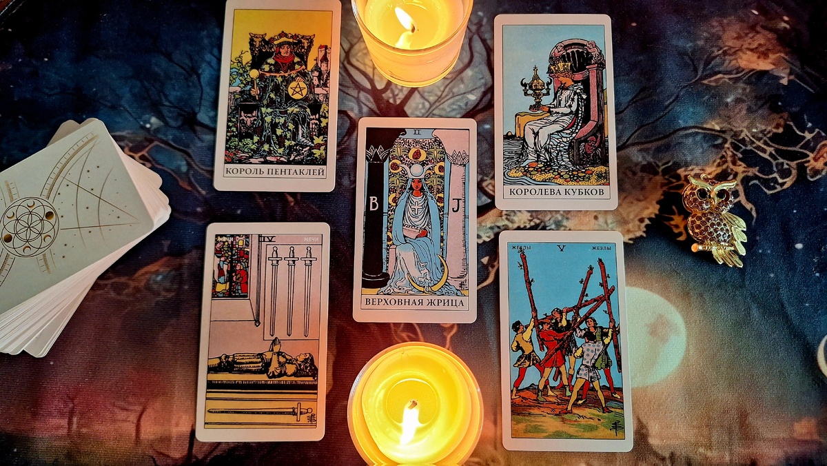 Я разложил карты, чтобы заглянуть в его закрытый сундук с сожалениями. Картина вышла глубокая, скрытая, но очень красноречивая: Король Пентаклей, Четвёрка Мечей, Королева Кубков, Пятёрка Жезлов, а в самом сердце расклада - таинственная Верховная Жрица.